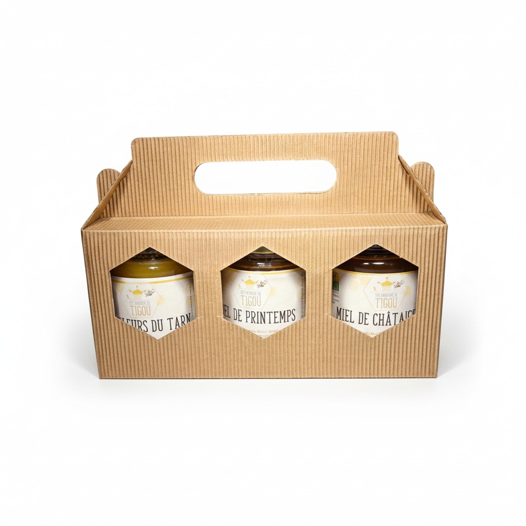Pour offrir ou pour faire déguster à vos proches, un très joli coffret cadeau dans son présentoir en carton ondulé avec un assortiment de 3 miels aux goûts différents.
